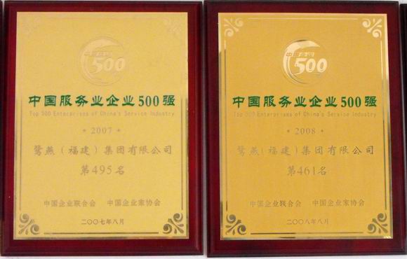 鹭燕集团又传捷报,在荣获了“市百强企业”、“市重点民营企业”、“湖里区十佳文明企业”之后,再次荣获“中国服务企业500强”称号,这已是鹭燕集团连续三年获此殊荣。