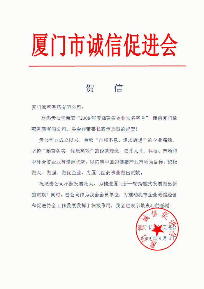 厦门市诚信促进会贺信