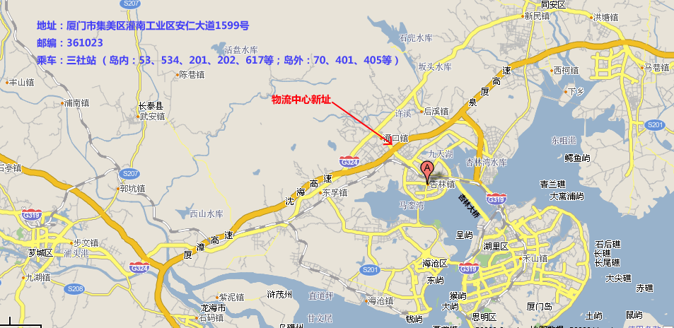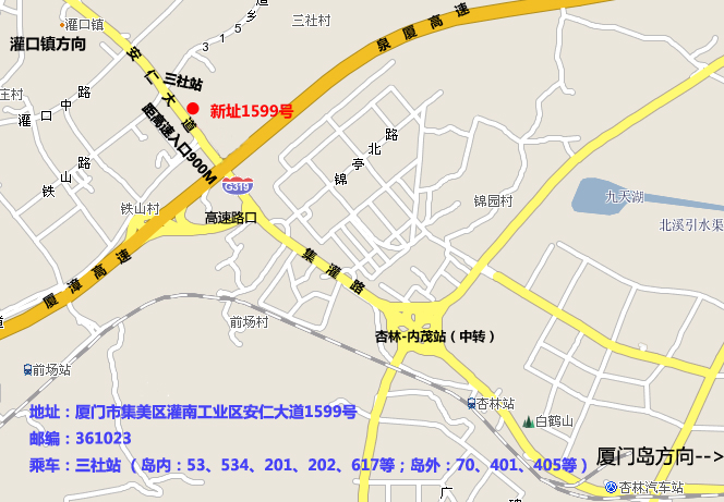 新址乘车:安仁大道—三社站(工业区路口)下车即可(岛内:可乘坐53、534、201、202、617公交车;岛外可乘坐70、401、405公交车),位置示意图如下: