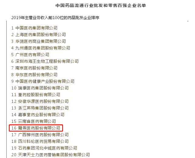 2019年药品流通行业百强榜单发布 www.8luck how 荣登十六位