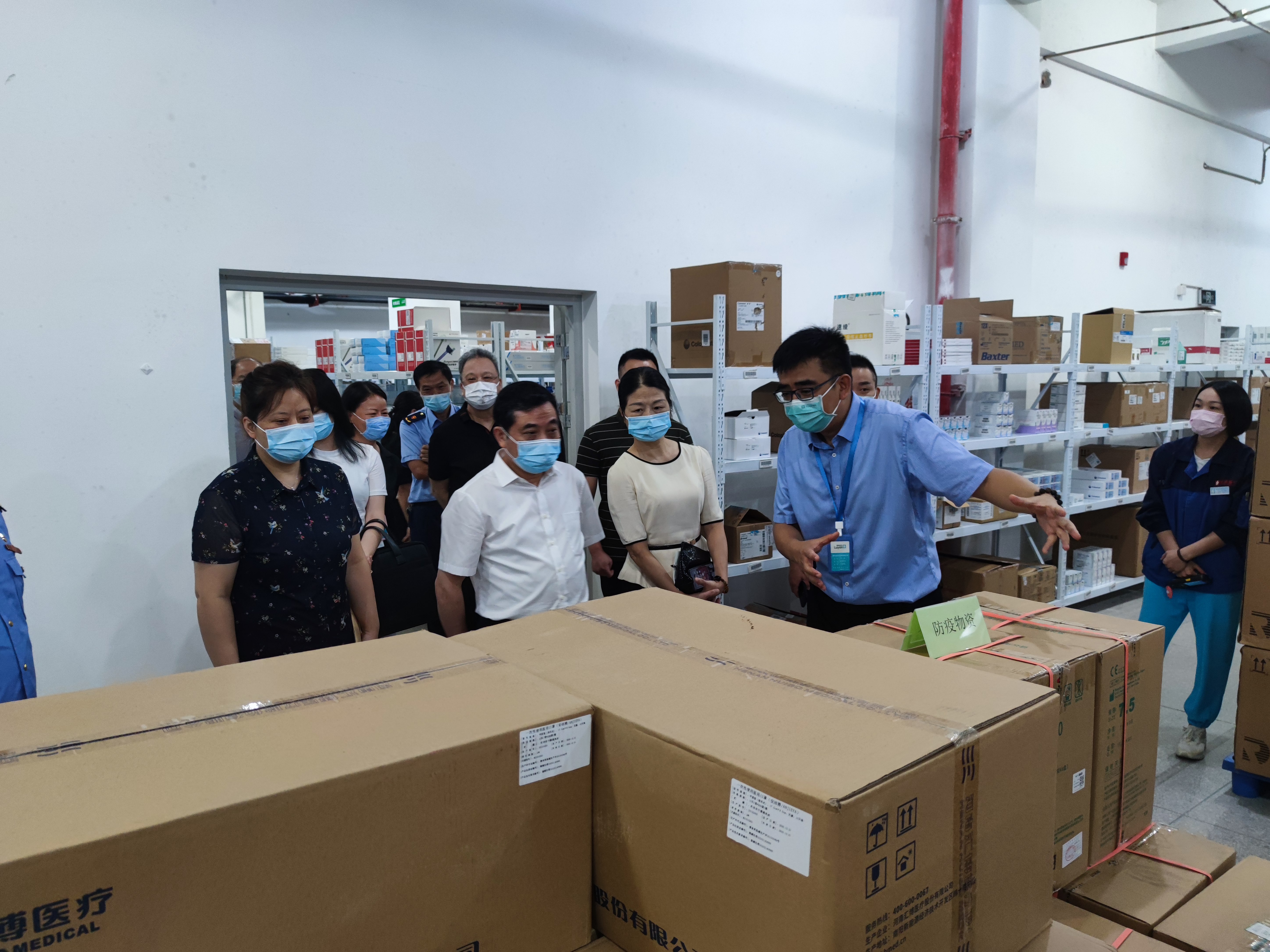 俞开海局长听取汇报后,对我司有效开展疫情防控工作,积极配合省市县政府做好应急防疫物资的配送,主动担当民营医药流通企业的社会责任给予了充分的肯定,并强调在做好应急保障确保防疫物资完成安全配送任务的同时,务必做好全公司人员、场所、环境的防控工作,做到企业经营和疫情防控同步开展、同步推进,共同为我省防控疫情作出贡献。同时对我司接下来的防疫工作重点作出如下指示:第一,继续全力以赴、扎实做好全省各地医疗机构的防疫物资供应,为打赢疫情防控歼灭战提供有力保障。第二,继续全力以赴抓好质量管控,确保防疫物资储存、运输等各个环节万无一失,保质保量完成任务。第三,全力做好防疫物资储备,防患未然。俞开海局长向随行的市、县领导作出相关指示,作为药品监管部门要与企业加强沟通联系,切实解决企业经营中遇到的实际困难和诉求,方能让企业、让员工安心投入防疫工作。