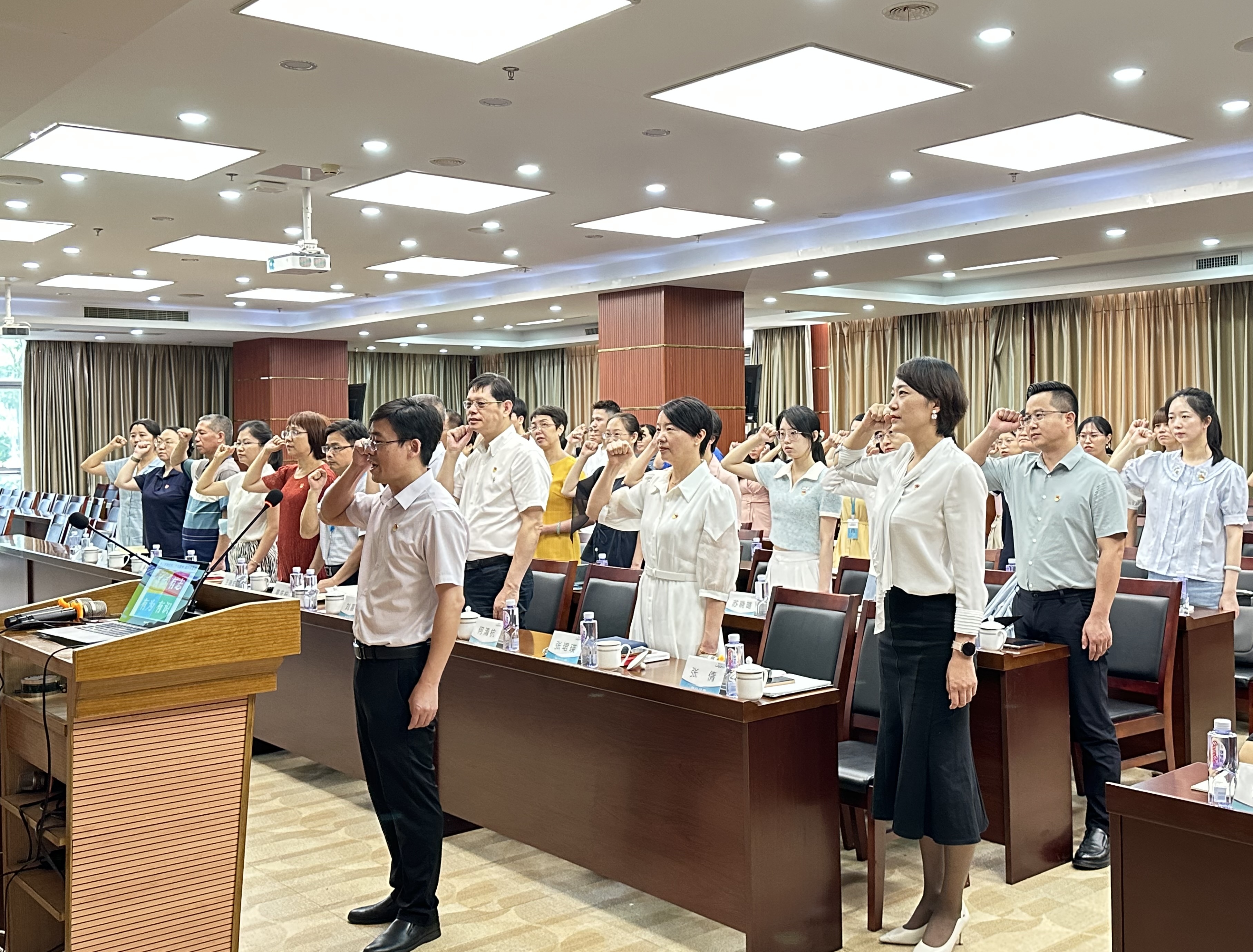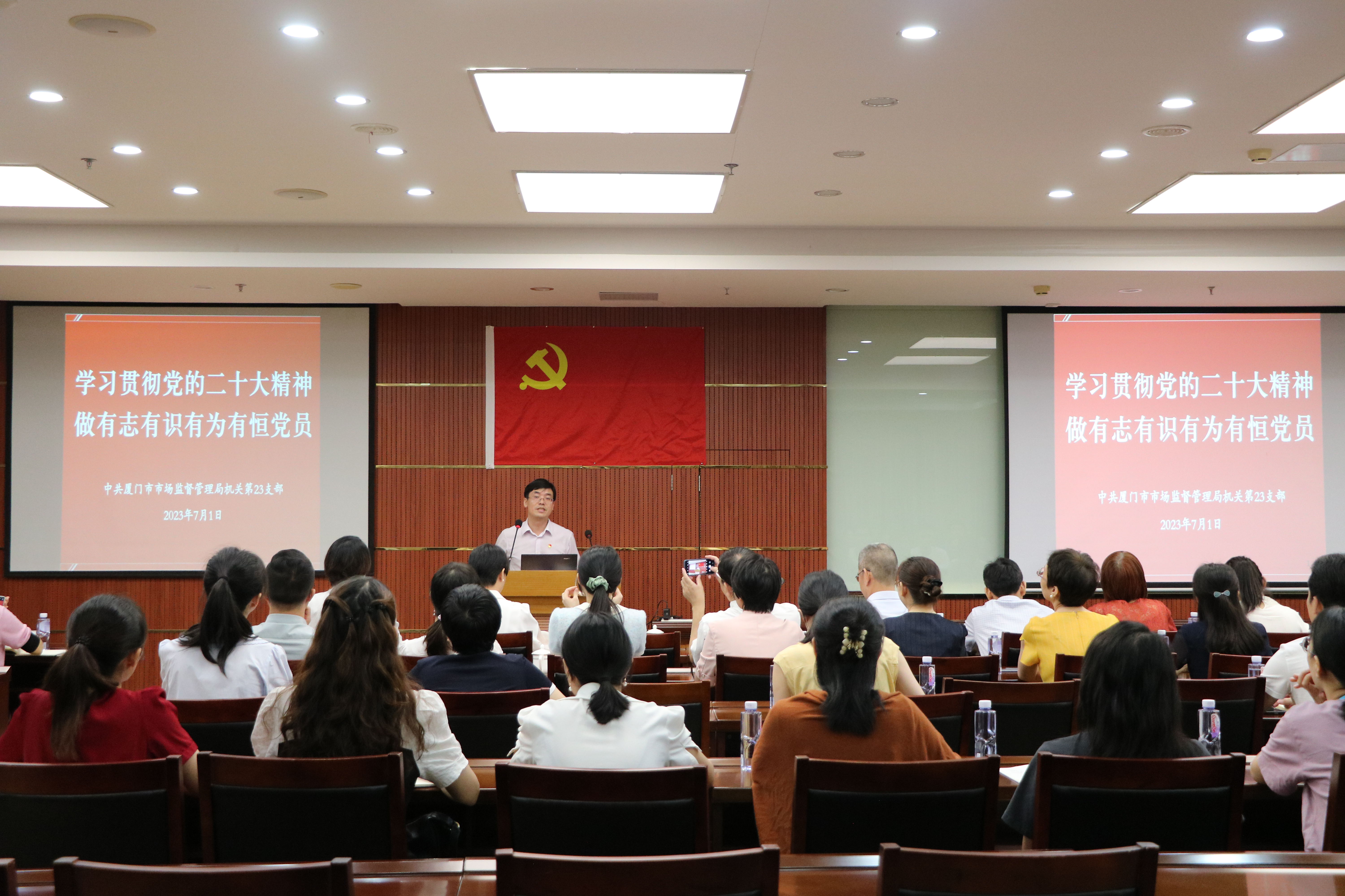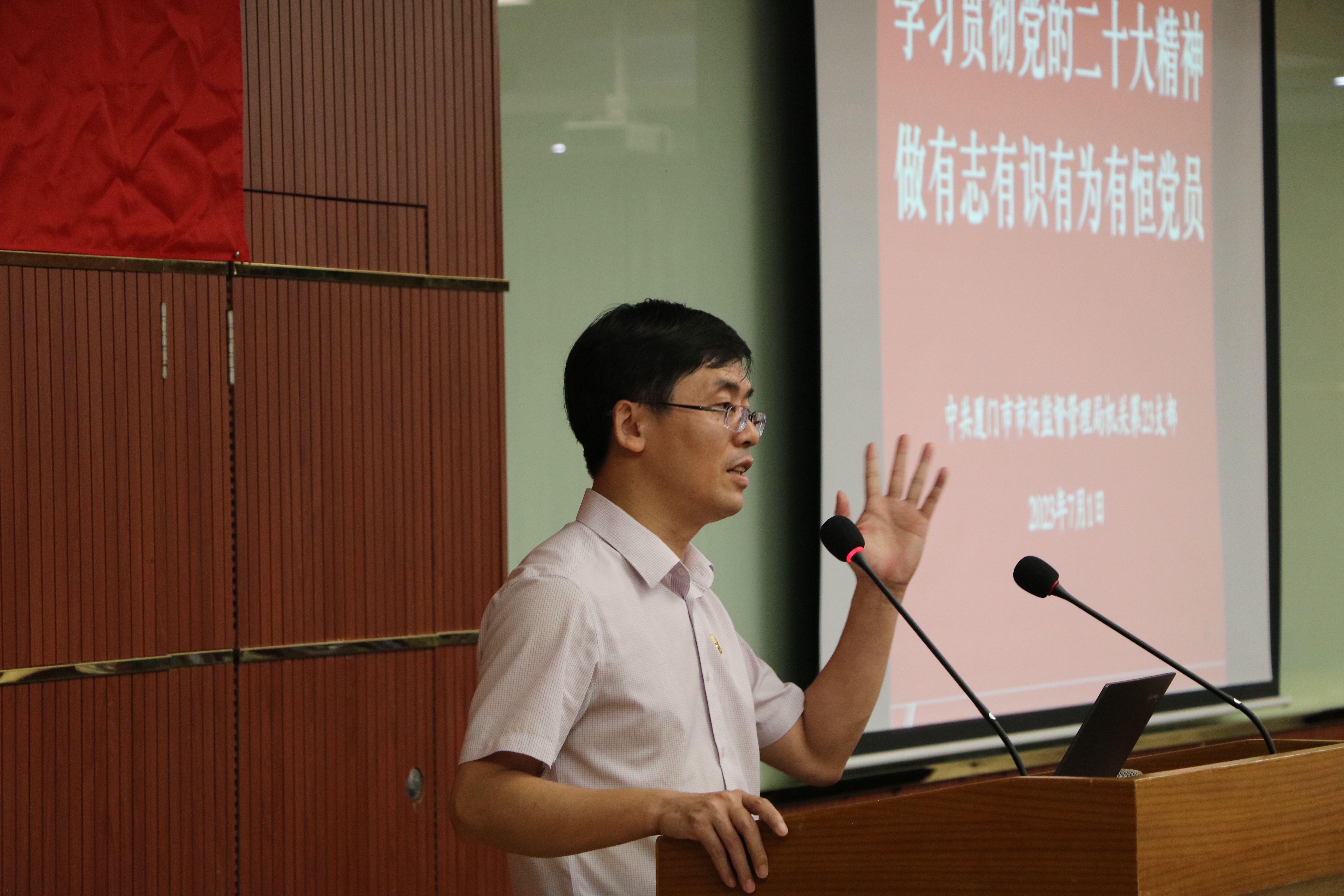 在这次联建共建中,中共厦门市市场监督管理局机关第二十三支部何清杭书记带来了一堂《学习贯彻党的二十大精神,做有志有识有为有恒党员》的主题党课。授课前,何书记作为领誓员,脱稿带领大家一起重温入党誓词,全体党员面对鲜红的党旗,庄严地举起右拳,铿锵有力、掷地有声地宣读誓词。