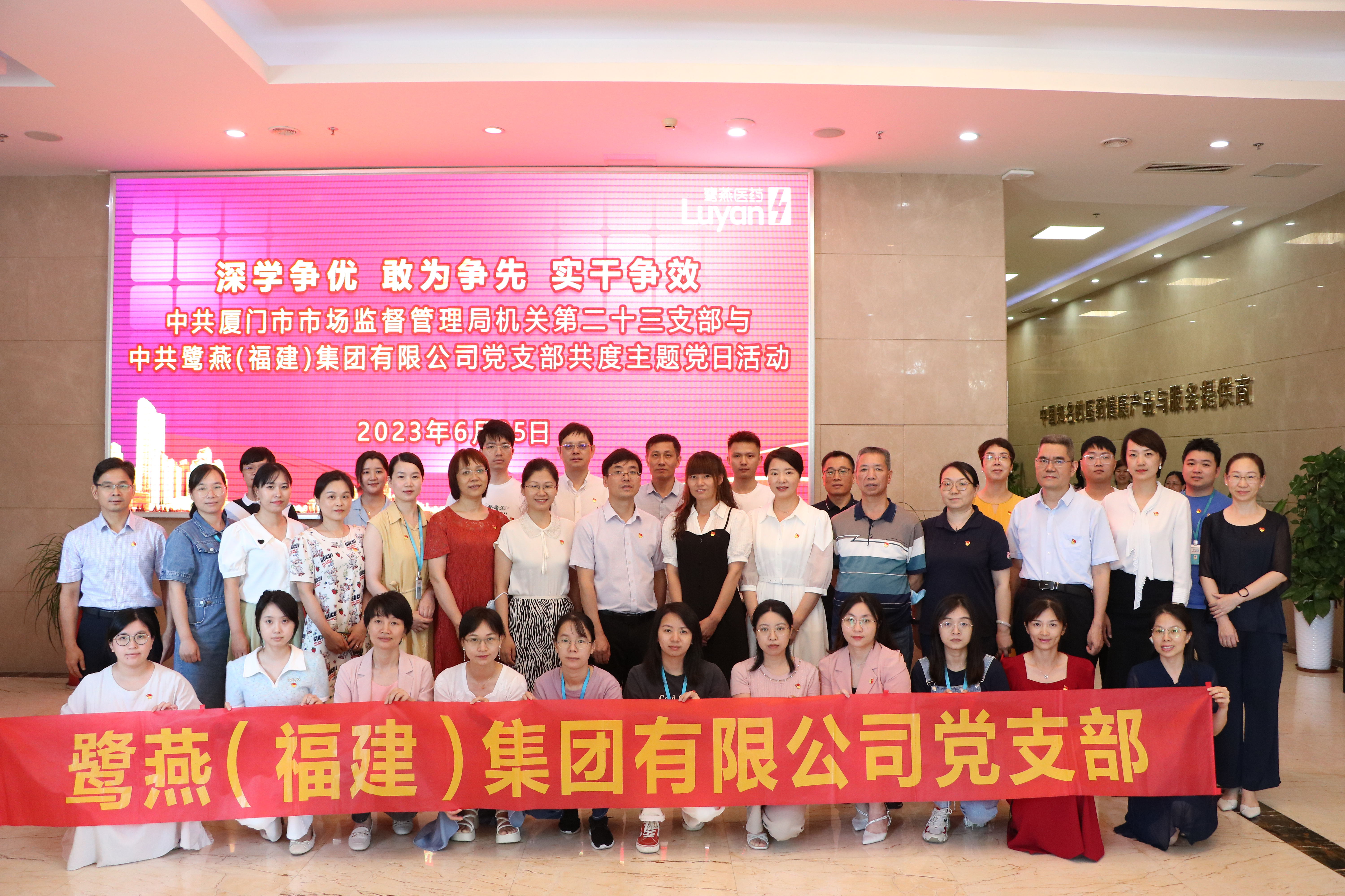 为深入学习贯彻党的二十大精神,庆祝中国共产党成立102周年,充分发挥党建工作对企业经营管理的引领力,鹭燕(福建)集团有限公司党支部积极主动对接监管部门基层党支部,与中共厦门市市场监督管理局机关第二十三支部共同开展主题党日活动。2023 年6月25日,活动在鹭燕总部大厦如期举行,中共厦门市市场监督管理局机关第二十三支部全体党员、鹭燕(福建)集团有限公司党支部党员以及鹭燕集团厦门区域部分成员公司总经理、质管干部参加了活动。