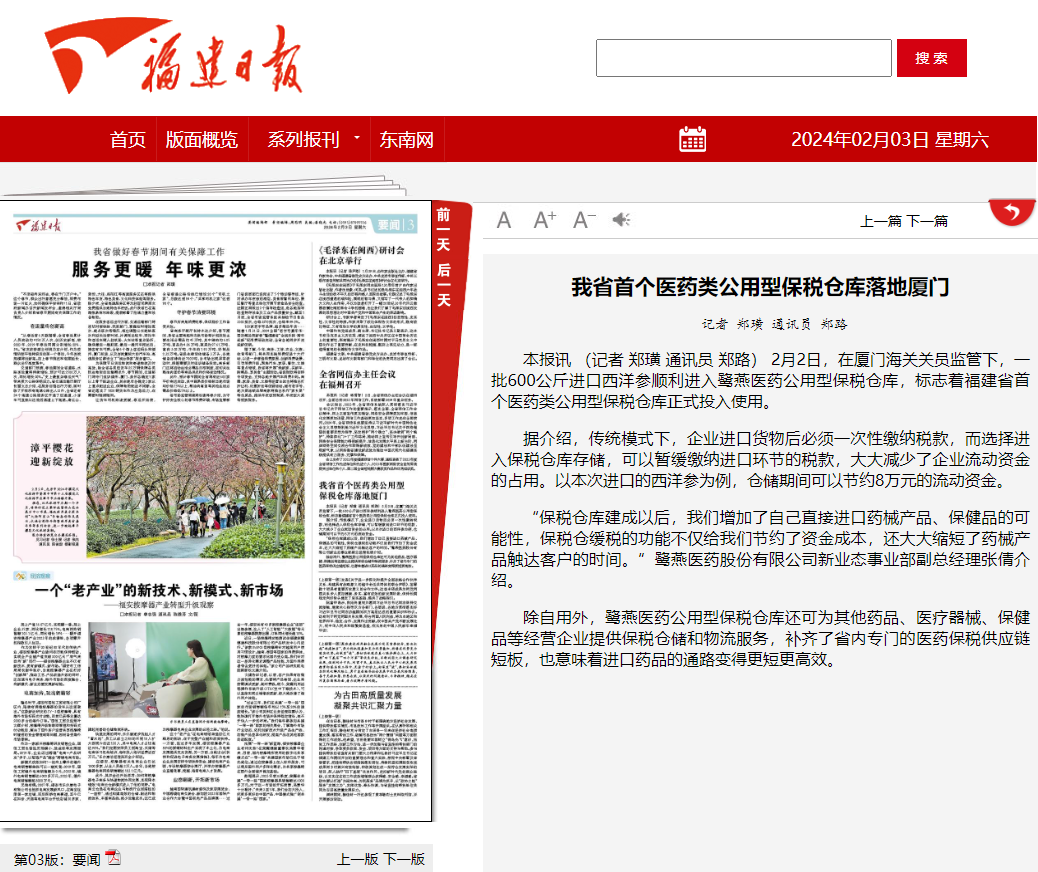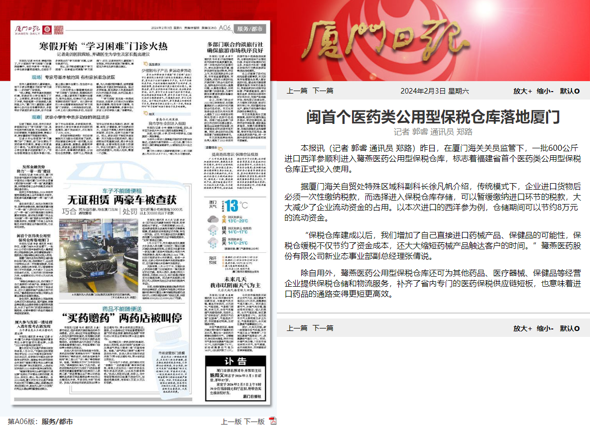 2024年2月2日,www.8luck how 公用型保税仓获批投用,《福建日报》《厦门日报》相继报道相关新闻。www.8luck how 公用型保税仓是福建省首个医药类公用型保税仓库,该保税仓库的投用,意味着厦门市乃至福建省补齐了区域内专门的医药保税供应链物流服务,也意味着厦门和福建进口药品的通路变得更短,更为高效。
