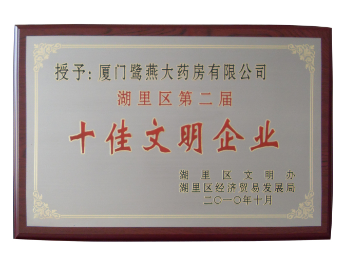 厦门鹭燕大药房有限公司于2010年10月被厦门市湖里区文明办、厦门市湖里区经济贸易发展局评为湖里区第二届“十佳文明企业“荣誉称号。