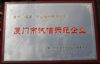 “2008 —2009年度厦门诚信示范企业”是厦门首个诚信企业评选活动。本活动由厦门市诚信促进会、厦门市企业和企业家联合会、各级政府机关等28个相关部门联合开展,组委会本着“公开、公正、公平”的原则首次在全市范围内共同开展诚信示范企业的评选。经过一系列激烈的竞争及组委会的严格评选,本企业最终获得了 “2008—2009年度厦门市诚信示范企业”的荣誉称号。